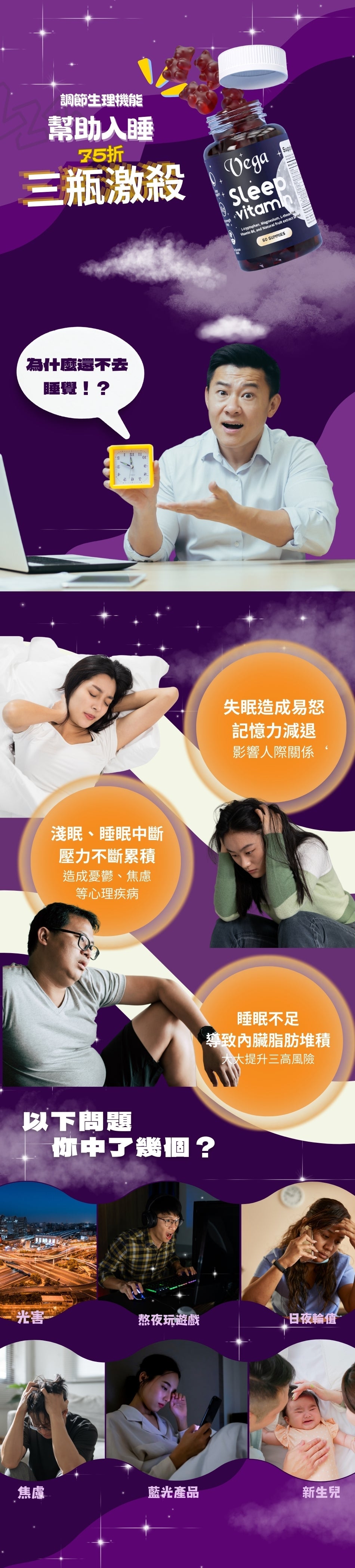 成人睡眠軟糖含有多種成分,鎮靜您的思緒,促進安寧的睡眠,讓您醒來時感覺神清氣爽。軟糖含有 L-茶氨酸、L-tryptophan(左旋色氨酸)瓦倫蘭根和香蜂草等植物成分,幫助您入睡並保持絕佳睡眠狀態。黑嘉麗口味的它們美味、且無乳製品、無麩質、非轉基因,純素。不含糖。